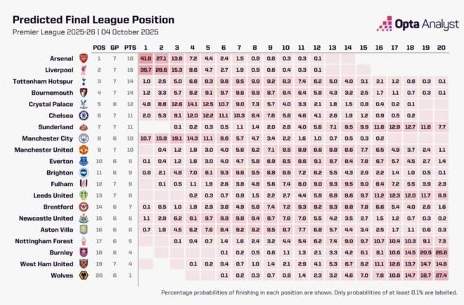 此役过后,数据机构 OPTA 超级计算机预测本赛季英超冠军,阿森纳以 41.6% 的概率捧杯,利物浦的夺冠概率为 35.7%,曼城则为 10.7%,切尔西的冠军率仅为 2.0%。