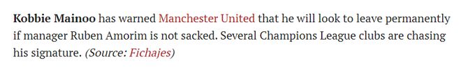 人们很难想象梅诺会有机会在下轮做客安菲尔德的英超「双红会」里首发,预计他将继续板凳坐穿。西班牙「Fichajes转会网」称,梅诺已经向曼联发出最后通牒,表示如果阿莫林没有下课,他将永久转会离队。
